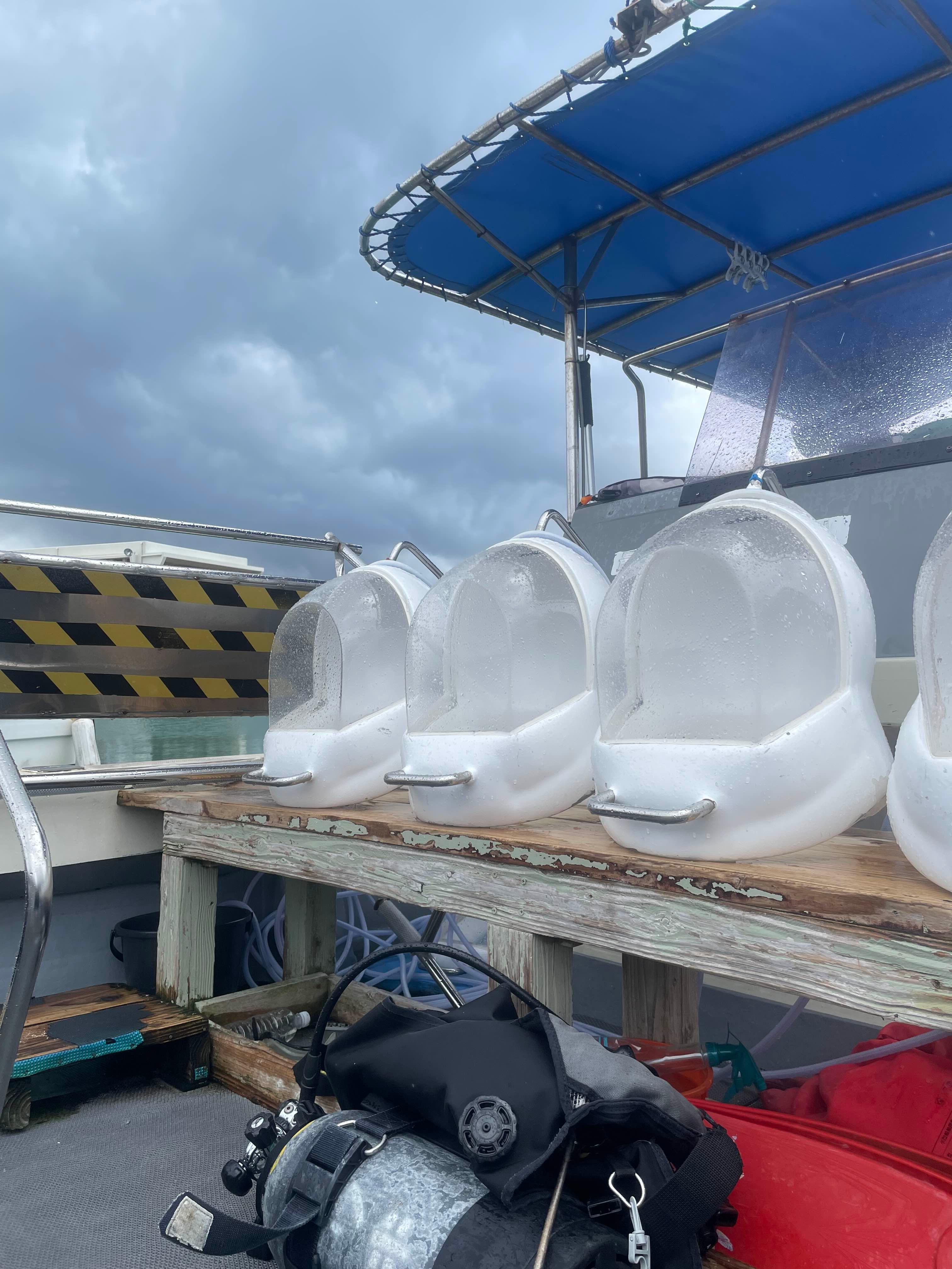 플라스틱으로 보이는 저 헬멧이 꽤나 무게가 나간다. 허리에 무거운 벨트를 채워주고 헬멧까지 쓰면 바다로 들어갈 준비 완료!
