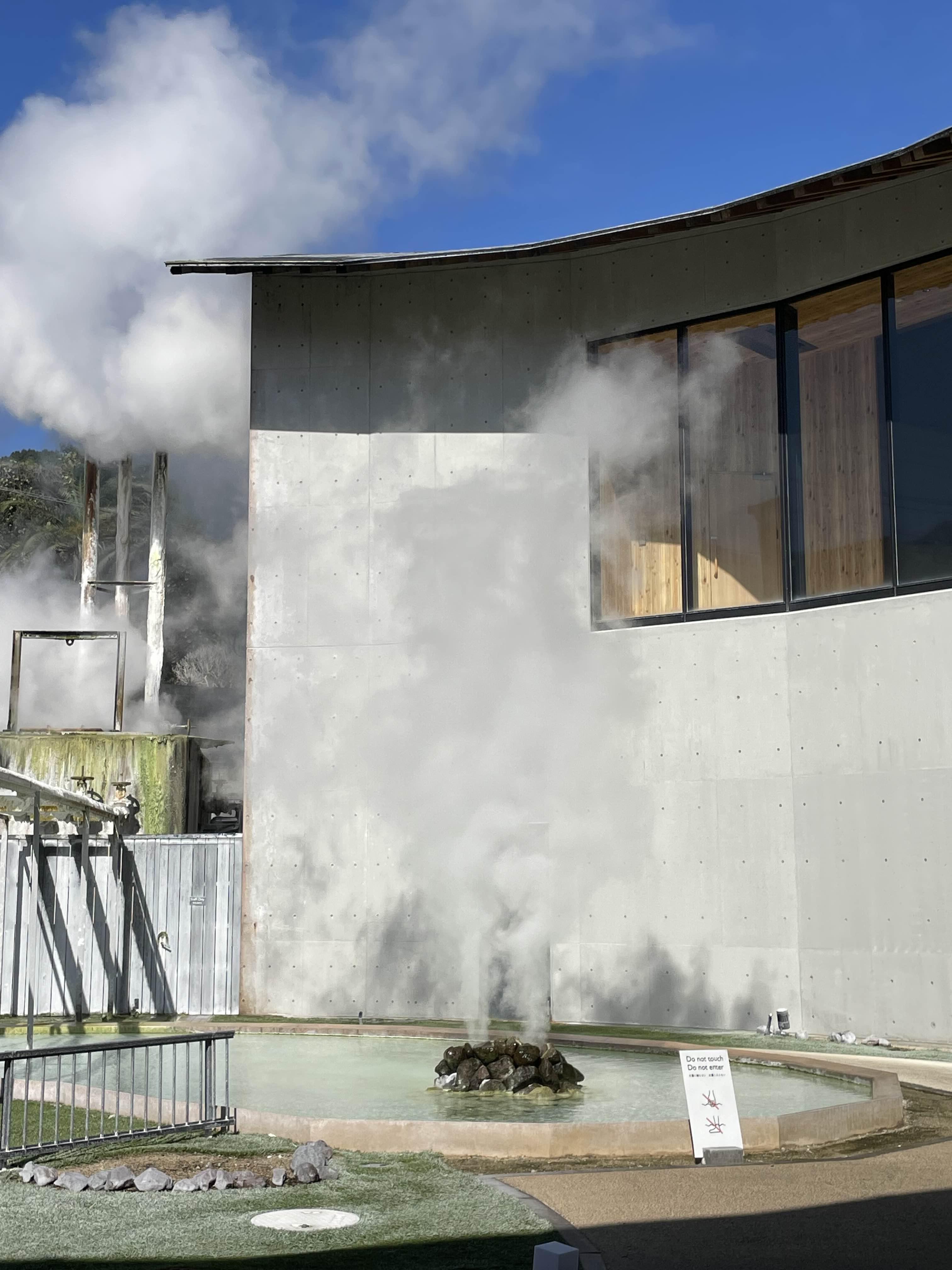 카페 야외 공간엔 김이 모락모락 나는 온천수가 있다. 가까이 가면 생각보다 더 뜨거움 ♨