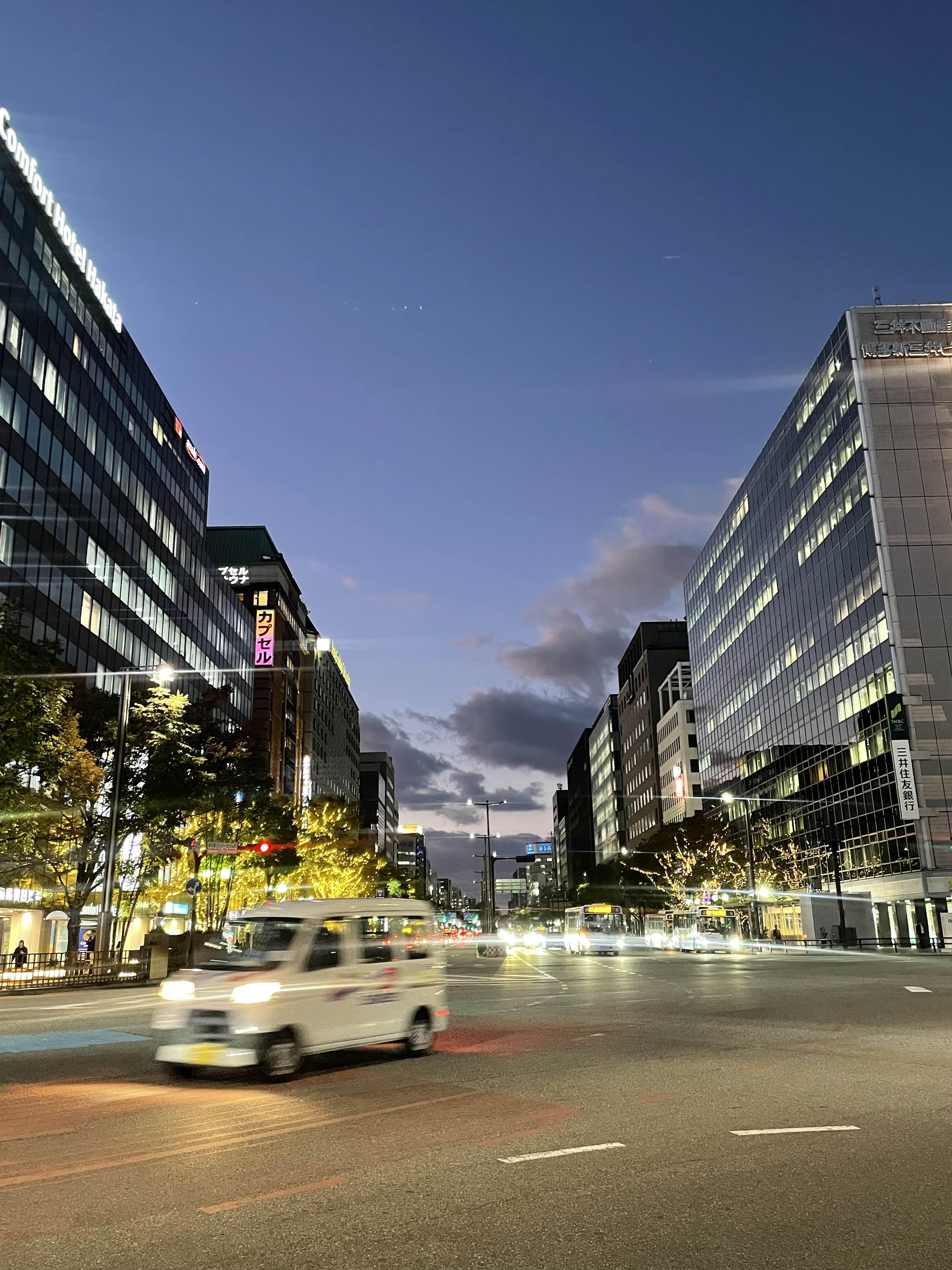 3. 버스에 타 좀이 쑤실 때쯤 도착한 후쿠오카 시내. 크리스마스를 앞둔 11월의 가로수엔 조명이 제 역할을 다하고 있었다. 크리스마스를 앞둔 시간엔 이렇게 곳곳에 설렘이 걸려있다.